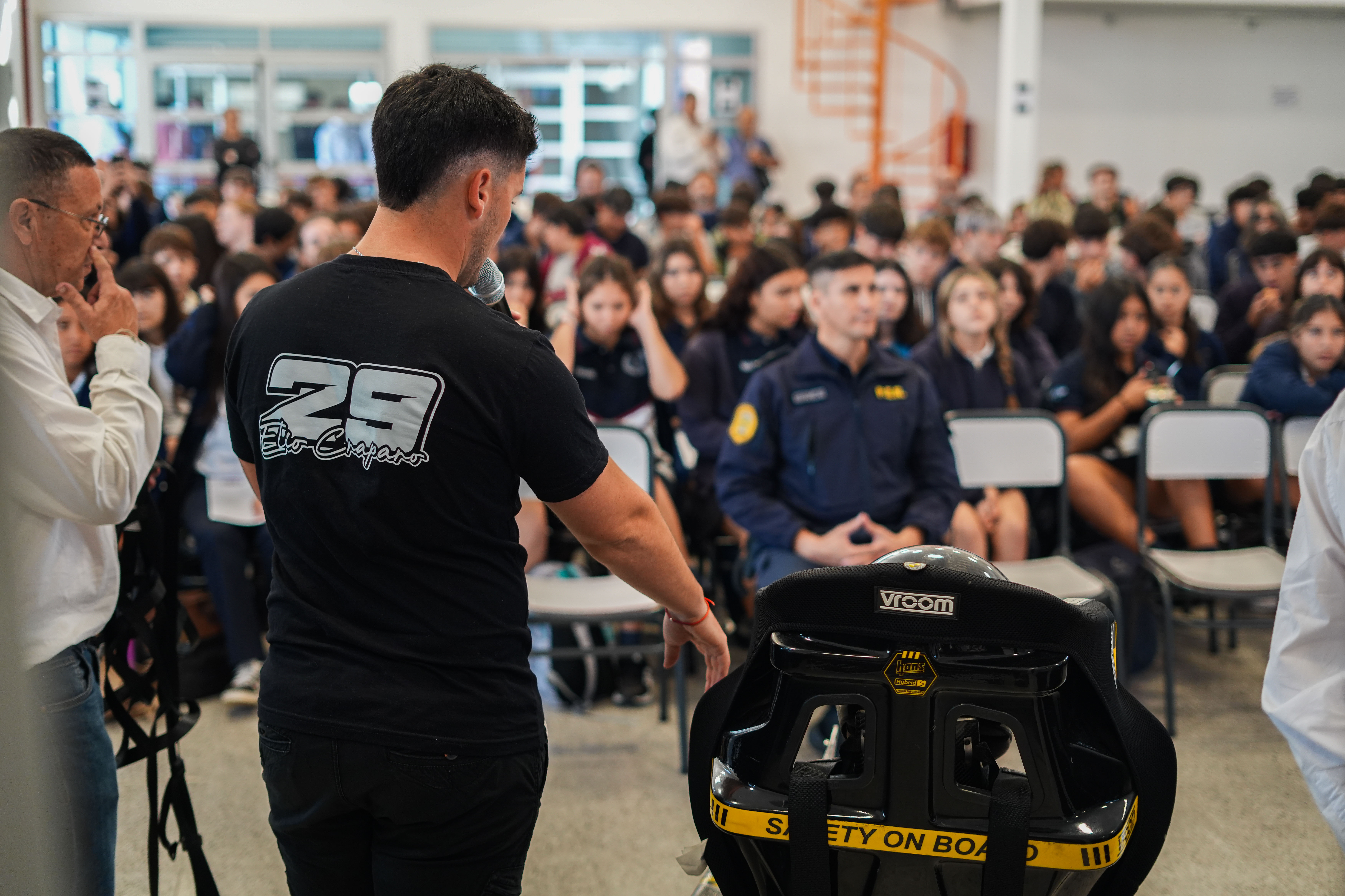Elio Craparo, piloto de Turismo Carretera, estuvo presente en el Taller de Educación Vial que se brindó en Concepción del Uruguay. El piloto de Chacabuco habló sobre las similitudes y diferencias que hay entre un auto de calle, uno de carreras y las leyes de tránsito con el reglamento deportivo. Además, pasó un grato momento con los alumnos, que se tomaron fotografías y se sacaron ciertas dudas sobre cómo es competir al más alto nivel.